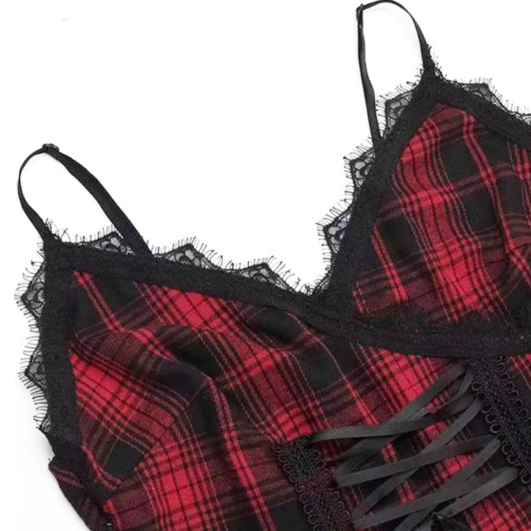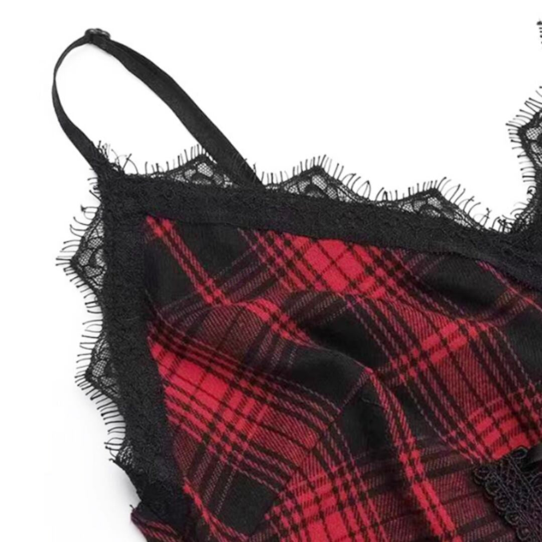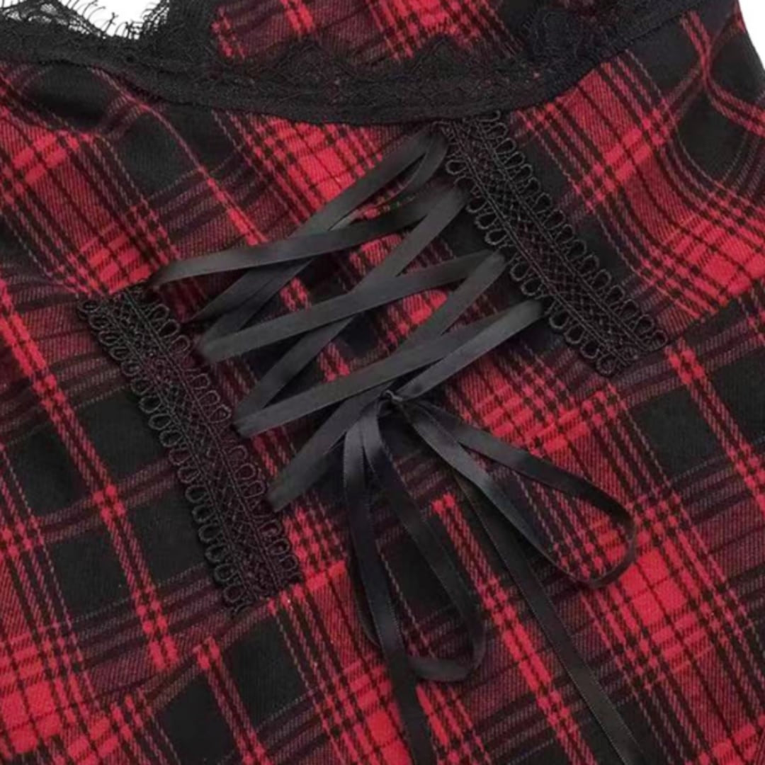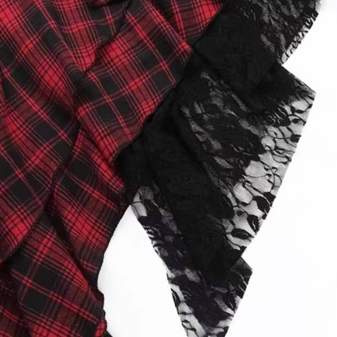 レッドのチェック柄が魅力的なアシンメトリックキャミソールドレス。