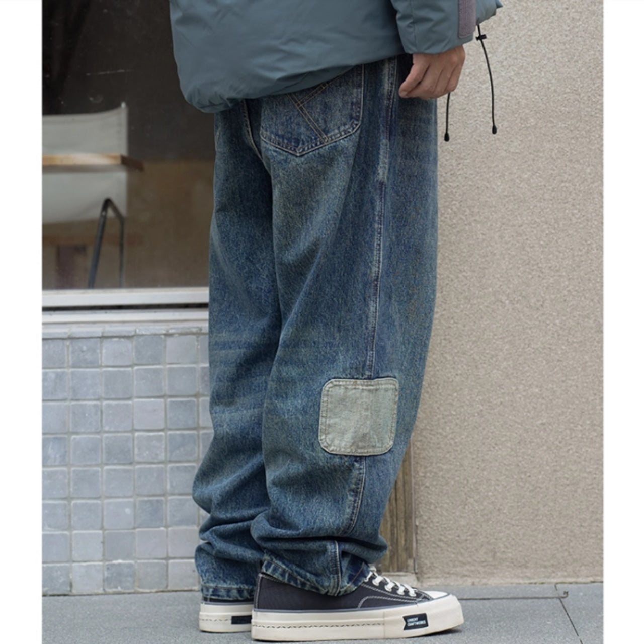 デニムアップリケがアクセントになった、程よくルーズなストレートデニム。