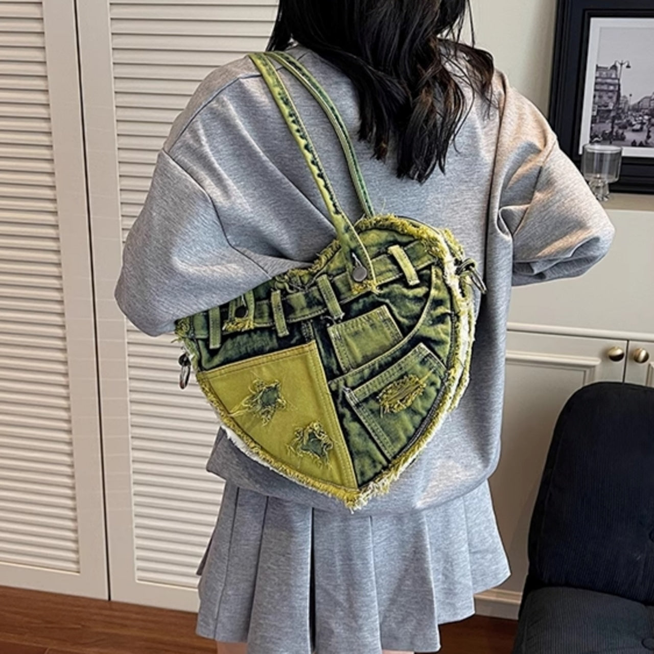 おしゃれなデザインと実用性を兼ね備えたハートデニムトートバッグ。